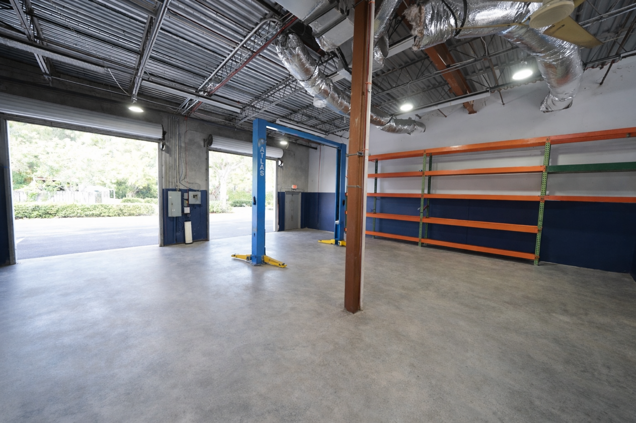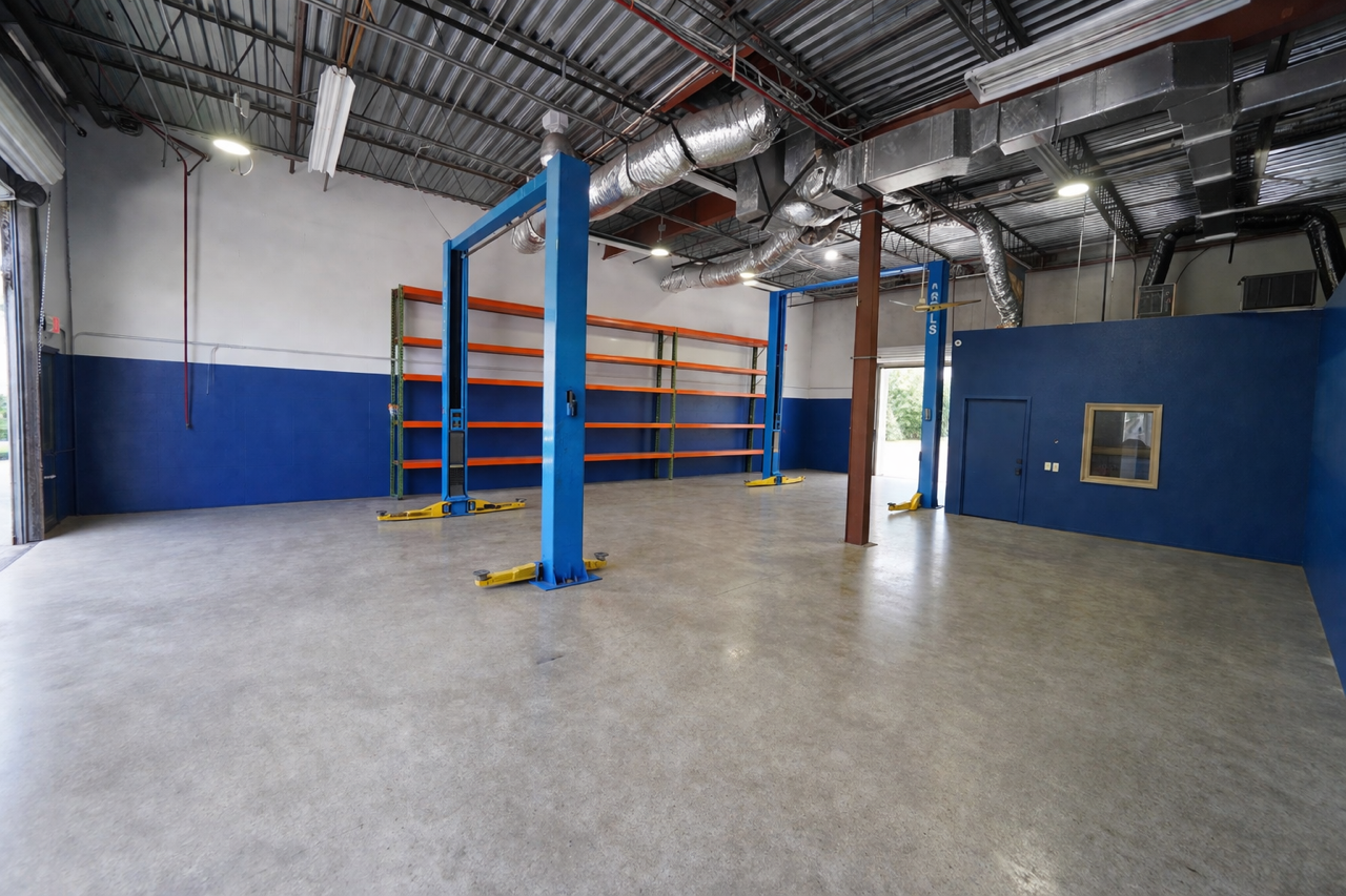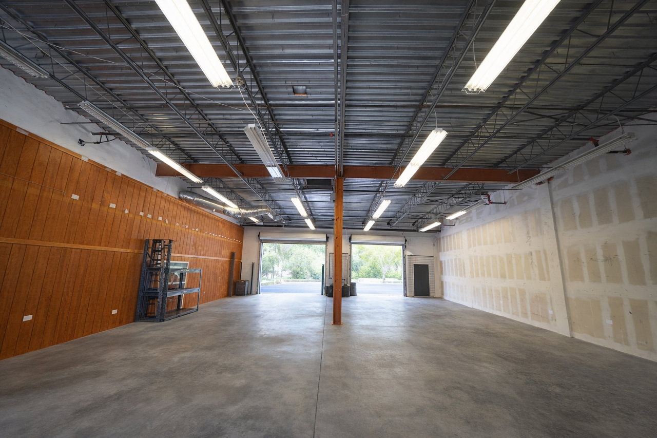 Versatile 4,000 SF office/warehouse corner unit featuring a finished office/reception area, open warehouse with 18′ ceilings, and six 10′ x 12′ overhead doors — two in front, four in rear — providing full drive-through capability. An adjacent 5,500 SF fenced and gated lot offers secure outdoor storage for vehicles, equipment, or materials.